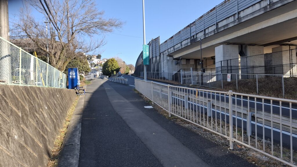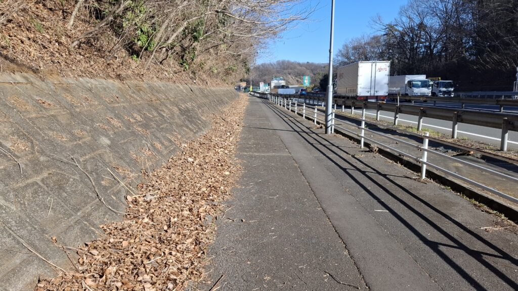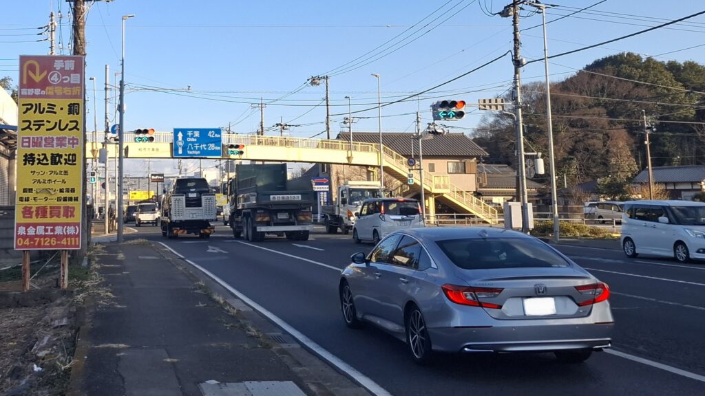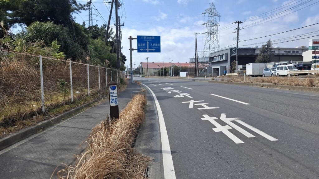 ここを左折し京葉道路沿いに進んでいきますが、側道の車道も自転車進入禁止なので歩道を走るか、インター手前の道を左折して側道に合流することになります。後者が良い選択かも。