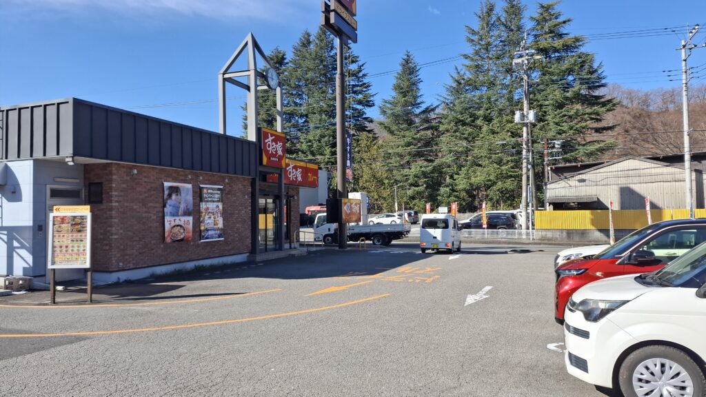 相模湖駅を出発してから1時間半、昼飯を食べるため牛丼屋に到着。