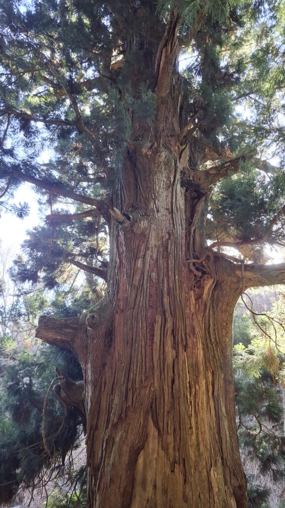 誰もいない、車も通らない静かな道を進むこと約4km。“矢立の杉”という観光スポットに到着。樹齢1000年を超える巨大な杉がそびえ立つ。